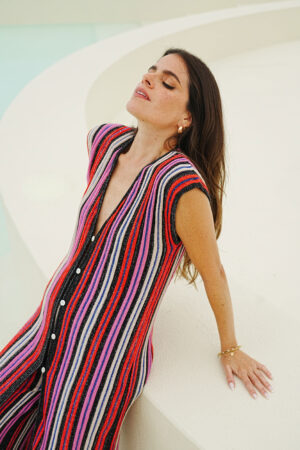 A yarn dress with fringes at the bottom. Each yarn composition was custom-made from scratch and dyed in the exact color we wanted.